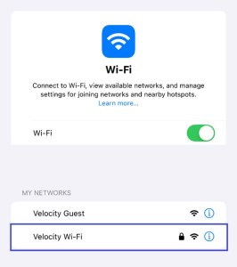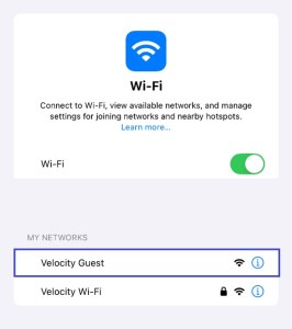 6. Navigate to your wireless networks and join your Velocity Wi-Fi, using the provided passphrase (password).